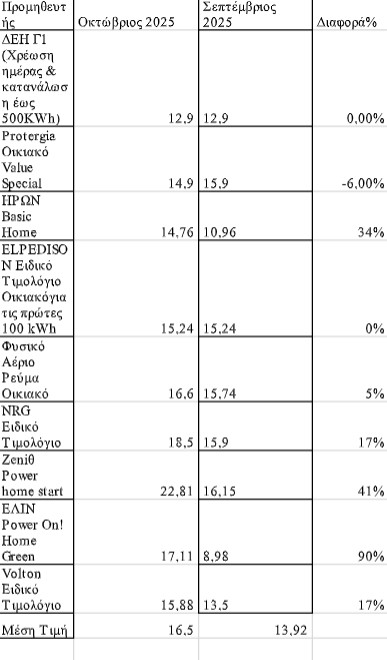 Στο πλαίσιο αυτό, χθες (Τετάρτη 1 Οκτωβρίου) η πλειονότητα των παρόχων ενέργειας ανακοίνωσε τις τιμές για τα πράσινα τιμολόγια του Οκτωβρίου, με τη ΔΕΗ (στην οποία βρίσκεται το 70% περίπου των νοικοκυριών που είναι στο συγκεκριμένο χρώμα) να διατηρεί αμετάβλητη την τιμή του κυμαινόμενου Γ1/Γ1Ν πράσινου οικιακού τιμολογίου στα 12,9 λεπτά ανά κιλοβατώρα, στα επίπεδα του Σεπτεμβρίου.