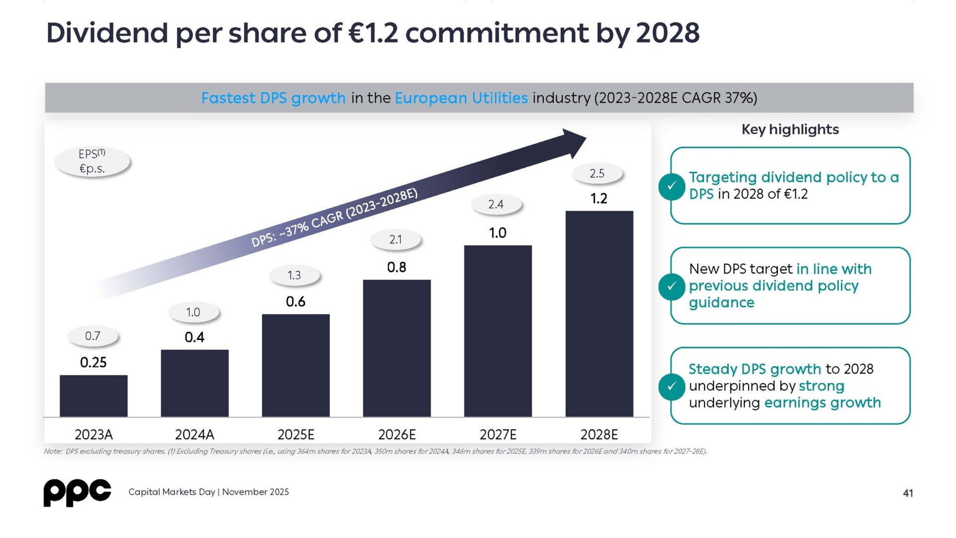 Σημειώνεται ότι ο στόχος για καθαρά κέρδη στο τέλος του 2028 ανεβαίνει στα 900 εκατ. ευρώ (υπερδιπλάσια σε σχέση με τον στόχο του 2025), για το μέρισμα ανά μετοχή στο 1,2 ευρώ/μετοχή (έναντι εκτίμησης για μέρισμα 0,8 ευρώ/μετοχή το 2026) και για τα κέρδη ανά μετοχή στα 2,5 ευρώ/μετοχή. Και όλα αυτά με χρηματοοικονομική πειθαρχία και τη δανειακή μόχλευση σταθερά κάτω από τον στόχο του δείκτη χρέους/EBITDA που έχει θέσει η ΔΕΗ, παρά τις μεγάλες επενδύσεις.