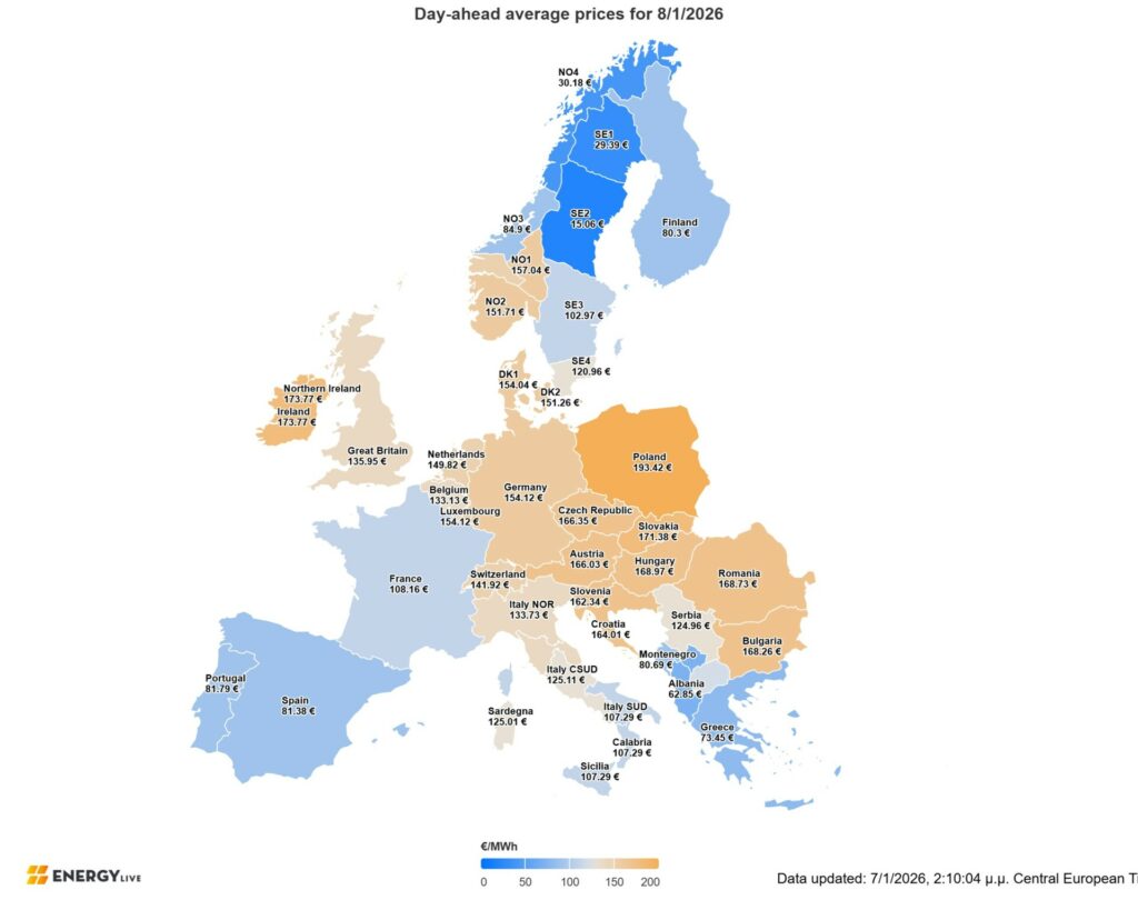 «Μποφόρ» χαμηλών τιμών… πνέουν τις τελευταίες ημέρες στο Ελληνικό Χρηματιστήριο Ενέργειας, διαμορφώνοντας στη χονδρική αγορά ρεύματος μια εικόνα πολύ διαφορετική από αυτήν που μας είχε συνηθίσει. Για σήμερα, λοιπόν (Πέμπτη 8 Ιανουαρίου), η ελληνική αγορά ηλεκτρισμού είναι η φθηνότερη της Ευρώπης, με μέση χονδρεμπορική τιμή 73,45 ευρώ/ΜWh, με πολύ μεγάλη απόκλιση από τις υπόλοιπες χώρες του «άξονα» Βουλγαρίας-Ρουμανίας- Ουγγαρίας, με τις οποίες η Ελλάδα ευθυγραμμιζόταν στα επεισόδια υψηλών τιμών και ακραίων διακυμάνσεων που είχαν παρατηρηθεί την τελευταία διετία. Είναι ενδεικτικό ότι η μέση τιμή στις τρεις αυτές χώρες σήμερα αγγίζει τα 170 ευρώ/MWh, όπως και στην Αυστρία, ενώ στην «πυρηνοκίνητη» Γαλλια διαμορφώνεται στα 108,16 ευρώ/MW, σε Ισπανία και Πορτογαλία (που συνήθως εμφανίζουν χαμηλότερη χονδρεμπορική τιμή σε σχέση με την Ελλάδα) λίγο κάτω από τα 82 ευρώ/MWh, στη Γερμανία στα 154,12 ευρώ/MWh και στην Ολλανδία στα 149,82 ευρώ/MWh.