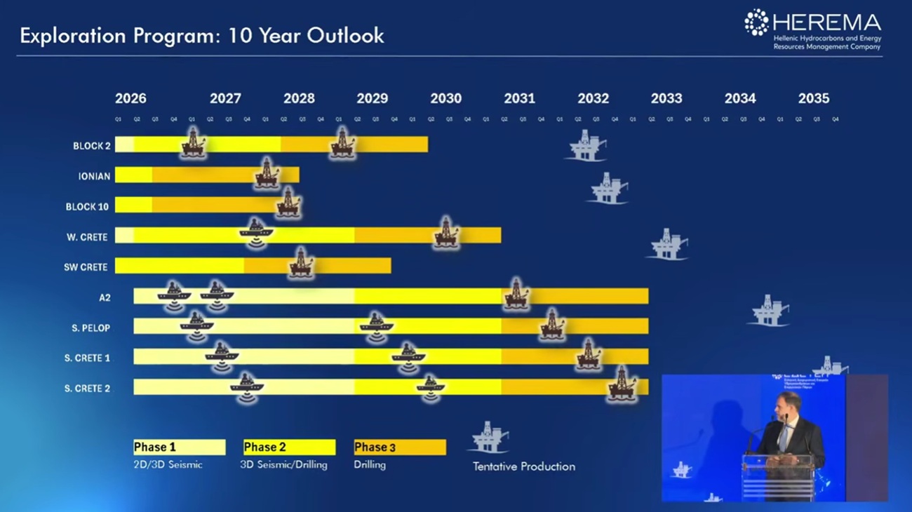 Σημειώνεται ότι ο διευθύνων σύμβουλος της ΕΔΕΥΕΠ, Αριστοφάνης Στεφάτος, παρουσίασε το χρονοδιάγραμμα και τα οικονομικά μεγέθη που συνδέονται με τις νέες συμβάσεις ερευνών, εκτιμώντας ότι, υπό την προϋπόθεση θετικών αποτελεσμάτων, η πρώτη παραγωγή εγχώριων υδρογονανθράκων θα μπορούσε να τοποθετηθεί χρονικά στην περίοδο 2032–2035. Όπως ανέφερε, πρόκειται για μια ρεαλιστική εκτίμηση που βασίζεται στον σημερινό σχεδιασμό των ερευνητικών προγραμμάτων, με σαφή επισήμανση ότι η πρόοδος των ερευνών και τα γεωλογικά δεδομένα θα καθορίσουν τελικά τον ακριβή ρυθμό εξέλιξης.