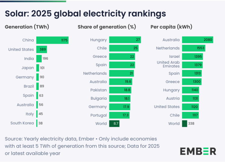 Σύμφωνα με τα στοιχεία του Ember, η χώρα με το μεγαλύτερο ποσοστό ηλιακής ενέργειας στο μείγμα ηλεκτροπαραγωγής της είναι η Ουγγαρία, με 27%, ενώ στη δεύτερη θέση βρίσκεται η Χιλή με 25%. Η Ελλάδα έχει μερίδιο 22%, όπως και η Ισπανία, ενώ ποσοστό 21% έχει η Ολλανδία. Τη δεκάδα συμπληρώνουν η Αυστραλία, το Πακιστάν, η Βουλγαρία, η Γερμανία και η Πορτογαλία. Παράλληλα, η Κίνα παραμένει ο παγκόσμιος ηγέτης στην παραγωγή ηλιακής ενέργειας σε απόλυτα νούμερα. Η συνολική παραγωγή ηλιακής ενέργειας της χώρας το 2025 έφτασε τις 1.175 TWh, ποσότητα μεγαλύτερη από το σύνολο των χωρών του ΟΟΣΑ μαζί (1.078 TWh) και περίπου τριπλάσια από εκείνη της δεύτερης μεγαλύτερης χώρας, των Ηνωμένων Πολιτειών (389 TWh).