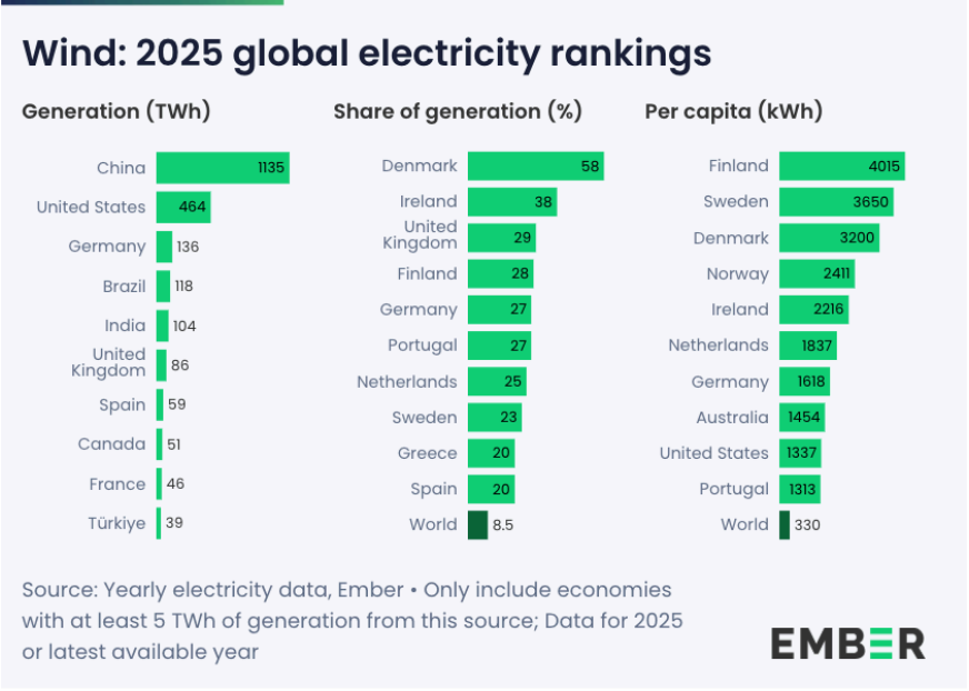 Ως προς την αιολική ενέργεια, το μερίδιό της στο μείγμα ηλεκτροπαραγωγής της Ελλάδας το 2025 έφτασε το 20%, ενώ στο ίδιο ποσοστό βρίσκεται και η Ισπανία. Στην κορυφή παγκοσμίως βρίσκεται η Δανία με ποσοστό 58%, ενώ ακολουθεί η Ιρλανδία (38%), το Ηνωμένο Βασίλειο (29%), η Φινλανδία (28%), η Γερμανία (27%), η Πορτογαλία (27%), η Ολλανδία (25%) και η Σουηδία (23%).