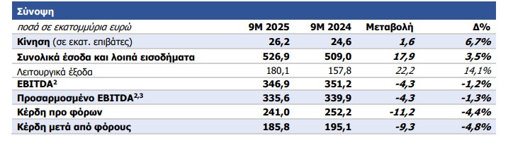 Κατά το εννεάμηνο του 2025, τα συνολικά κέρδη προ φόρων, τόκων και αποσβέσεων (EBITDA) διαμορφώθηκαν σε 346,9 εκατ. ευρώ, μειωμένα κατά 4,3 εκατ. ευρώ ή 1,2% σε σύγκριση με την αντίστοιχη περίοδο του προηγούμενου έτους. Το προσαρμοσμένο EBITDA διαμορφώθηκε σε 335,6 εκατ. ευρώ, μειωμένο κατά 1,3% σε σχέση με το εννεάμηνο του 2024, εναρμονισμένο με τους βραχυπρόθεσμους στόχους της Εταιρείας.