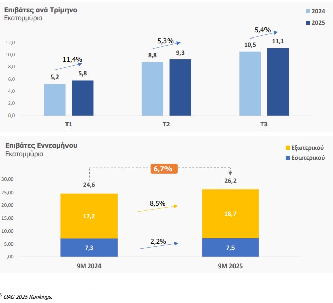 - Η επιβατική κίνηση το εννεάμηνο του 2025 ανήλθε σε 26,1 εκατ. επιβάτες, αυξημένη 6,7% σε σχέση με το εννεάμηνο του 2024.