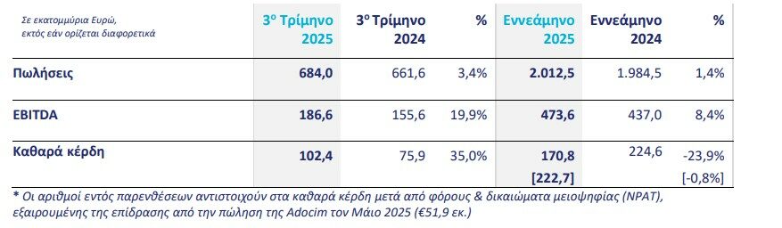 Ο Όμιλος συνέχισε την ανοδική του πορεία κατά το τρίτο τρίμηνο, καταγράφοντας ισχυρή αύξηση πωλήσεων και κερδοφορίας. Οι πωλήσεις του τριμήνου ανήλθαν σε 684 εκατ., σημειώνοντας αύξηση 3,4% σε ετήσια βάση, αντικατοπτρίζοντας τις θετικές τάσεις που επικράτησαν σε όλους τους γεωγραφικούς τομείς. Τα κέρδη EBITDA διαμορφώθηκαν στο υψηλό επίπεδο των 186,6 εκατ. ευρώ, αυξημένα κατά 19,9%, χάρη στις σταθερές τιμές, την αποτελεσματική διαχείριση του κόστους και τη βελτίωση των λειτουργικών επιδόσεων.