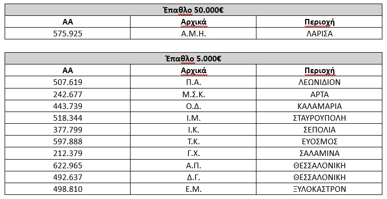 Πιο συγκεκριμένα, στην 10η κλήρωση τα μεγάλα έπαθλα των 50.000€ & 5.000€ κέρδισαν οι ακόλουθοι: