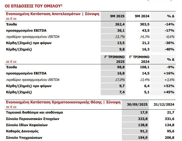 Ενοποιημένα Έσοδα στα €262,4εκ μειωμένα κατά 14% έναντι του Εννεαμήνου 2024, λόγω των παρακάτω παραγόντων οι οποίοι είχαν ήδη επηρεάσει αρνητικά τα αποτελέσματα Εξαμήνου 2025: