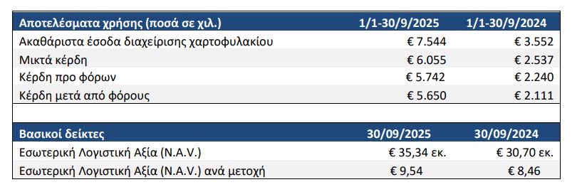 Για την περίοδο από 01/01/2025 έως 30/09/2025 το χαρτοφυλάκιο της εταιρείας σημείωσε απόδοση 18,54% με την εσωτερική αξία του χαρτοφυλακίου (Ν.Α.V.) να ανέρχεται σε 35,34 εκατ. ευρώ ή 9,54 ευρώ ανά μετοχή στις 30/09/2025.