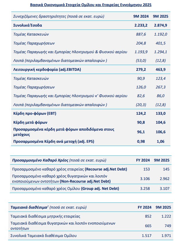 Καθαρά κέρδη προς μετόχους εξαιρουμένων μη λειτουργικών αποτελεσμάτων. Πιο συγκεκριμένα: α) της ζημιάς ποσού 2,1 εκ. € από την αποτίμηση των παραγώγων (έναντι κέρδους 0,9 εκ. € την αντίστοιχη περυσινή περίοδο), β) της ζημιάς ποσού 0,1 εκ. € από την αποτίμηση προθεσμιακών συμβολαίων αγοραπωλησίας Ηλεκτρικής ενέργειας και Φυσικού αερίου (έναντι ζημίας 3,5 εκ. € την αντίστοιχη περυσινή περίοδο), γ) του κέρδους 13,3 εκ. € από τις αποτιμήσεις λοιπών συμμετοχών (έναντι κέρδους 4,9 εκ. € την αντίστοιχη περυσινή περίοδο), και δ) της ζημιάς 11,2 εκ. € από πρόβλεψη κόστους για το πρόγραμμα διανομής δωρεάν μετοχών για τις χρήσεις 2024-2027 σε Στελέχη του Ομίλου.