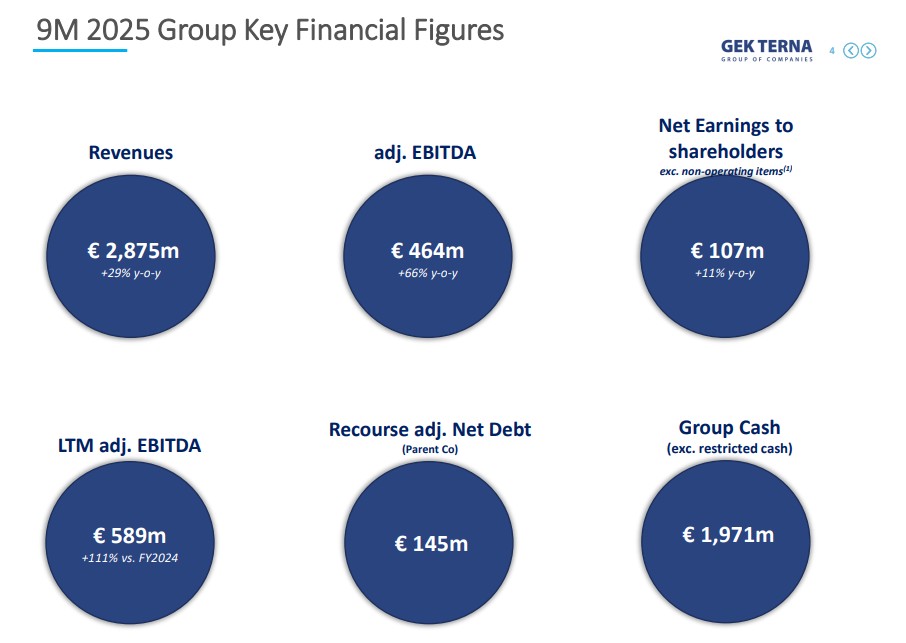 Ισχυρά οικονομικά μεγέθη κατέγραψε η ΓΕΚ-ΤΕΡΝΑ στο εννεάμηνο. Ο Όμιλος σημείωσε αύξηση εσόδων κατά 28,7% στα 2,87 δισ. ευρώ, λειτουργικής κερδοφορίας (adj.EBITDA) κατά 66,2% στα 463,9 εκατ., προσαρμοσμένα καθαρά κέρδη 106,6 εκατ. ευρώ αυξημένα κατά 11%, ενώ η ρευστότητά του παραμένει ισχυρή με ταμειακά διαθέσιμα 2 δισ. ευρώ. Ο τομέας παραχωρήσεων κατέγραψε 112% άνοδο στα adj.EBITDA φτάνοντας τα 267,3 εκατ. ευρώ και καλύπτοντας το 57% του συνόλου του Ομίλου. Το υπογεγραμμένο ανεκτέλεστο στις 30 Σεπτεμβρίου 2025 ανήλθε σε 6,8 δισ. ευρώ, από 4,1 δισ. ευρώ την 31η Δεκεμβρίου 2024, ενώ τα προς υπογραφή έργα φτάνουν τα 2,4 δισ. ευρώ, διαμορφώνοντας συνολικό ανεκτέλεστο 9,2 δισ. ευρώ.