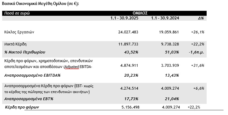 Τα EBITDA σε συγκρίσιμα μεγέθη παρουσίασε σημαντική βελτίωση και διαμορφώθηκε στα 4,87 εκατ., ήτοι αυξημένα κατά +31,6% έναντι της αντίστοιχης περσινής περιόδου, επιβεβαιώνοντας τις στρατηγικές επιχειρηματικές αποφάσεις του ομίλου για την ενίσχυση της λειτουργικής κερδοφορίας.