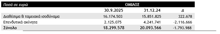 Στις 30 Σεπτεμβρίου 2025, ο όμιλος διατηρούσε μηδενικό δανεισμό, ενώ τα ταμειακά διαθέσιμα και ισοδύναμα παρέμειναν σε υψηλά επίπεδα, πιστοποιώντας τη διατήρηση της ισχυρής ρευστότητας.