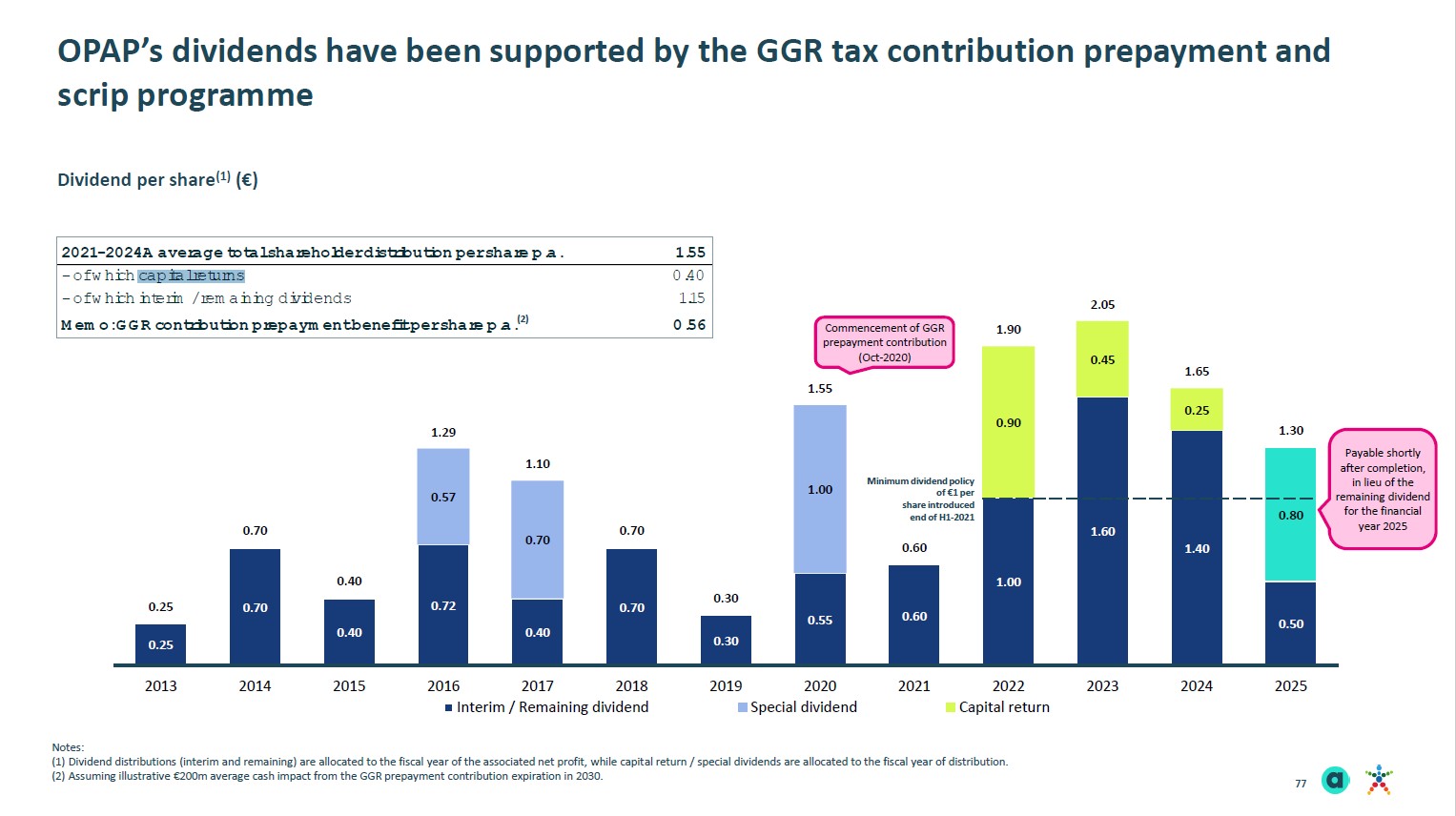 Ειδικότερα η εταιρεία έχει μοιράσει 13 ευρώ ανά μετοχή, περίπου 4,8 δισ. ευρώ, εκ των οποίων τα 3,3 δισ. ευρώ μόνον μέσα στην περίοδο 2019-2025. Ο ΟΠΑΠ είναι ίσως η μοναδική εταιρεία που έδωσε ανελλιπώς μέρισμα την περίοδο 2013 έως σήμερα. Ακόμη και το 2015 με τα capital controls η εταιρεία διένειμε μέρισμα 0,40 ευρώ ανά μετοχή.