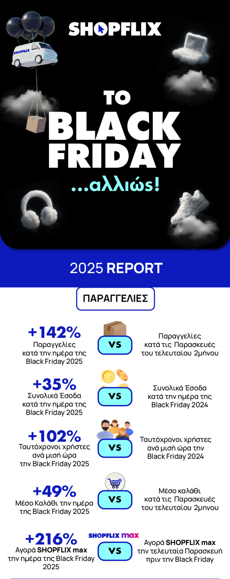 - Οι χρήστες φαίνεται να αξιοποίησαν τη νέα υπηρεσία SHOPFLIX max για δωρεάν μεταφορικά στις Black Friday αγορές τους, αφού σημειώθηκε 216% αύξηση στις αγορές της την ημέρα της Black Friday 2025 σε σχέση με την τελευταία Παρασκευή πριν την Black Friday.
