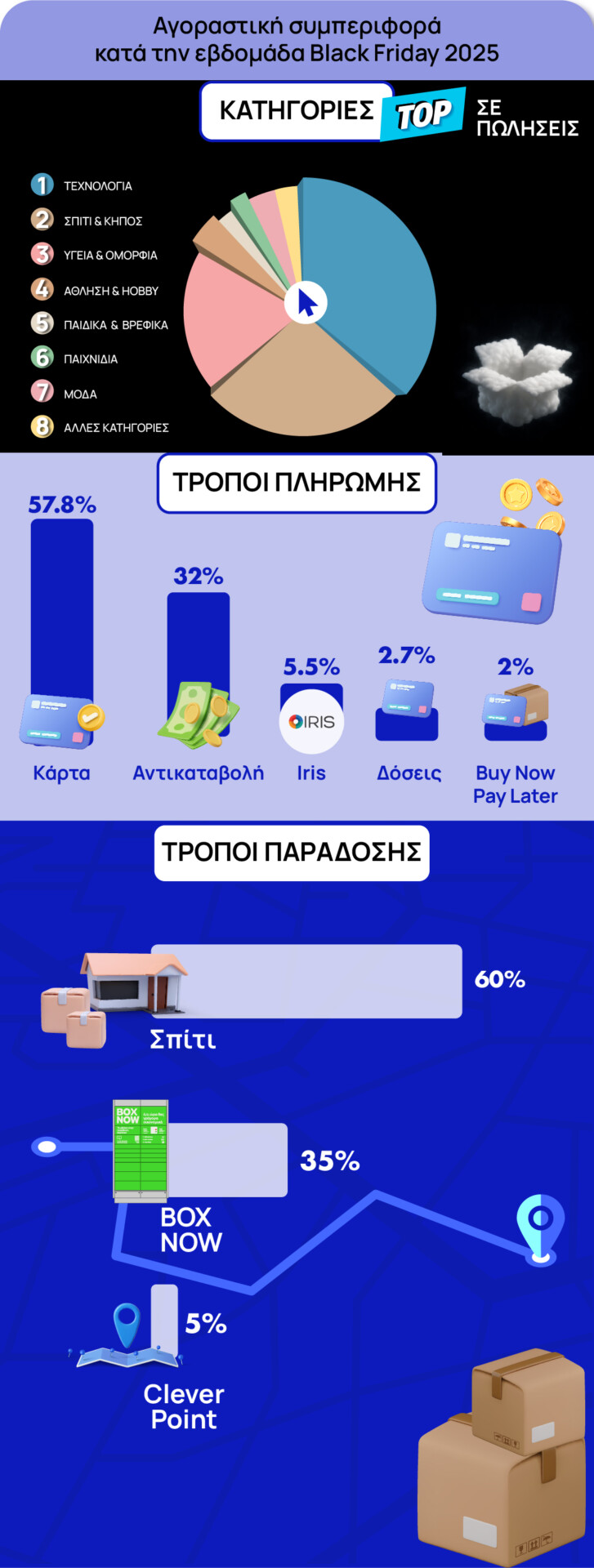 Στους τρόπους παράδοσης, η αποστολή στο σπίτι παρέμεινε η πιο δημοφιλής επιλογή, συγκεντρώνοντας το 60% των παραγγελιών της εβδομάδας Black Friday. Η ευέλικτη λύση της παράδοσης σε locker και το BOX NOW κατέγραψε ισχυρή παρουσία με 35%, ενώ τα σημεία Clever Point κάλυψαν το 5% των παραδόσεων.