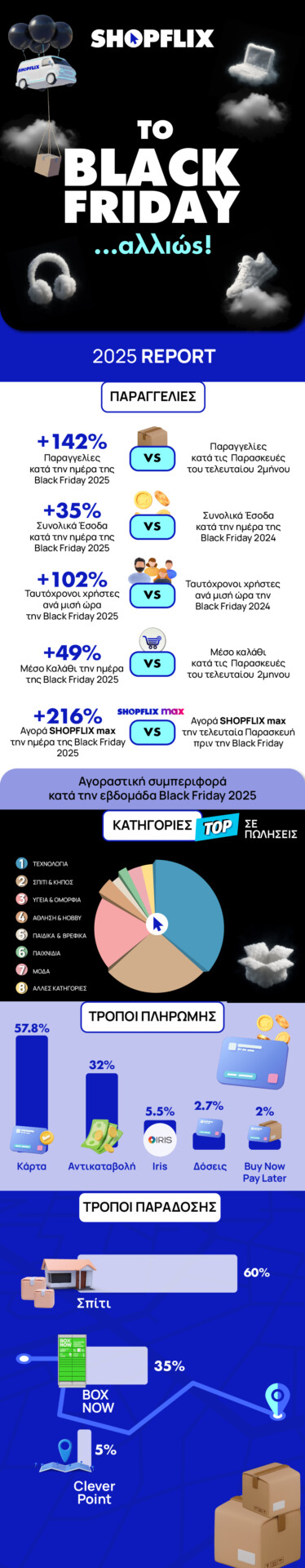 - Τα συνολικά έσοδα του SHOPFLIX (GMV) σημείωσαν 35% αύξηση την ημέρα της Black Friday 2025 σε σχέση με την περσινή αντίστοιχη μέρα.