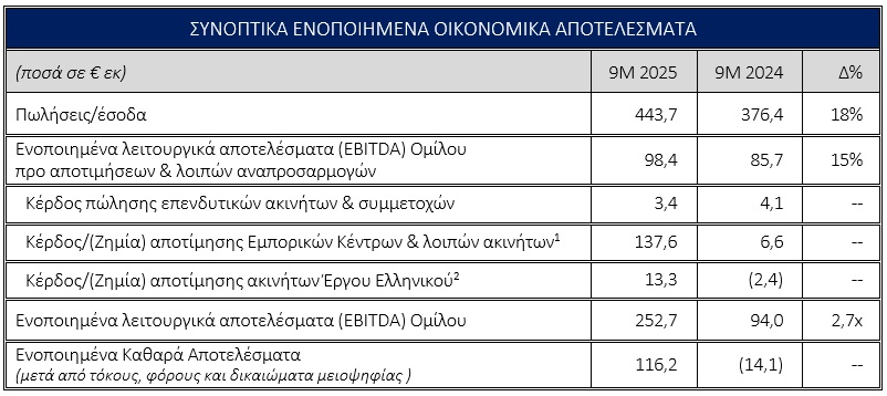 - Tα κέρδη EBITDA του Ελληνικού προ αποτιμήσεων ανήλθαν στα €32,2εκ αυξημένα κατά 5% σε σχέση με το Εννεάμηνο 2024