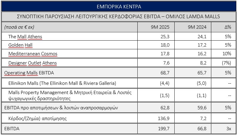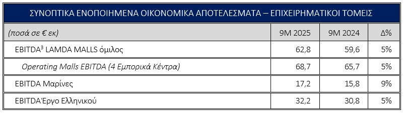 - Νέο ιστορικό ρεκόρ Operating Malls EBITDA στα €68,7εκ αυξημένο κατά 5% σε σχέση με το Εννεάμηνο 2024