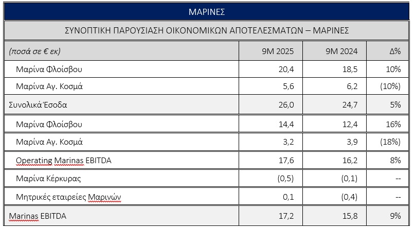 - Tα κέρδη EBITDA για τις Μαρίνες ανήλθαν στα €17,2εκ αυξημένα κατά 9% σε σχέση με το Εννεάμηνο 2024