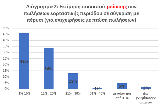 - Στις επιχειρήσεις που πραγματοποίησαν χαμηλότερες πωλήσεις κατά τη φετινή εορταστική περίοδο, το 46% δήλωσε μείωση έως 10%, και 1 στις 3 (34%) δήλωσε πτώση τζίρου από 11% έως 20% (Διάγραμμα 2). Αυτό σημαίνει πως, με αναγωγή επί του συνόλου των επιχειρήσεων του δείγματος της Έρευνας, 4 στις 10 (42%) δήλωσαν μείωση τζίρου έως και 20%.