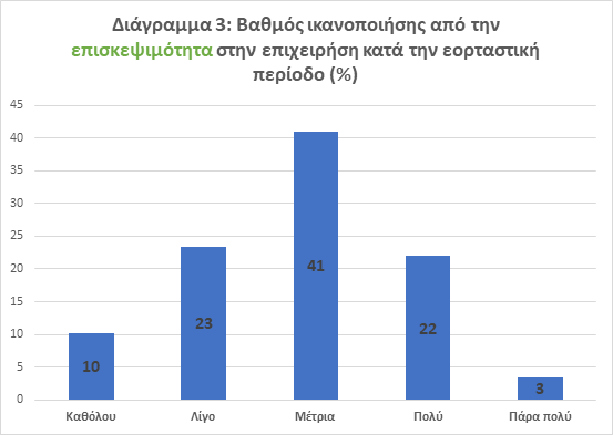 - Τέσσερις στις 10 επιχειρήσεις (41%) εμφανίζονται μέτρια ικανοποιημένες από την επισκεψιμότητα στα καταστήματα, ενώ 3 στις 10 (33%) παρουσιάζονται λίγο έως καθόλου ικανοποιημένες (Διάγραμμα 3).