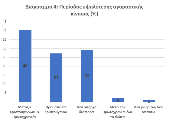 - Σε παλαιότερες έρευνες, η καλύτερη περίοδος για την αγοραστική κίνηση εντοπιζόταν στο χρονικό διάστημα που προηγείτο των Χριστουγέννων. Φέτος, για 4 στις 10 επιχειρήσεις (40%), η αγοραστική κίνηση κορυφώθηκε μεταξύ Χριστουγέννων και Πρωτοχρονιάς (Διάγραμμα 4), εύρημα που είχε παρατηρηθεί και την αντίστοιχη περυσινή περίοδο.