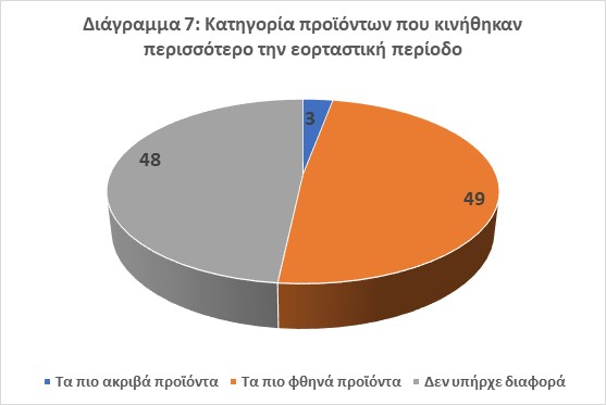 - Κατά τη φετινή εορταστική περίοδο οι προτιμήσεις των καταναλωτών ανάμεσα σε ακριβά και φθηνά προϊόντα ήταν σχεδόν απόλυτα ισορροπημένη (48% και 49%), (Διάγραμμα 7).