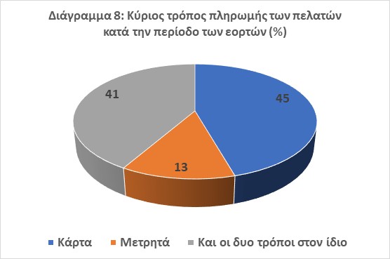 - Η ψηφιακή ωριμότητα, η οποία επιταχύνθηκε εξαιτίας και της υγειονομικής κρίσης του κορωνοϊού, έχει μεταβάλει τον τρόπο πληρωμής των καταναλωτών καθώς μόλις στο 13% των επιχειρήσεων οι συναλλαγές πραγματοποιήθηκαν κυρίως με μετρητά (Διάγραμμα 8).