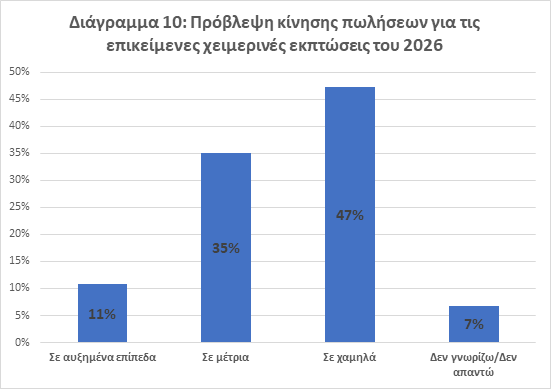 - Οι πρόσφατες εξελίξεις καθιστούν τις επιχειρήσεις μάλλον συγκρατημένες αναφορικά με τις προβλέψεις τους για τις πωλήσεις κατά τη διάρκεια των χειμερινών εκπτώσεων του 2026 (Διάγραμμα 10). Οι μισές επιχειρήσεις (47%) αναμένουν τις πωλήσεις τους να κινηθούν σε χαμηλά επίπεδα ενώ 1 στις 3 (35%) σε μέτρια.