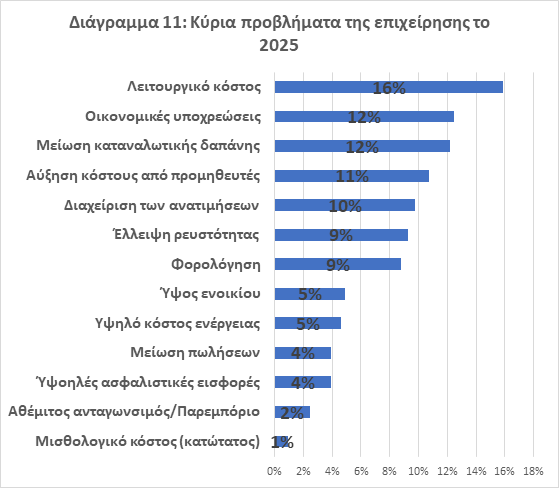 - Στις κυριότερες προκλήσεις οι επιχειρήσεις ιεραρχούν το Λειτουργικό κόστος, τις Οικονομικές Υποχρεώσεις, τη Μείωση της καταναλωτικής δαπάνης, την Αύξηση κόστους προμηθευτών, τη Διαχείριση των ανατιμήσεων κ.ά. (Διάγραμμα 11).