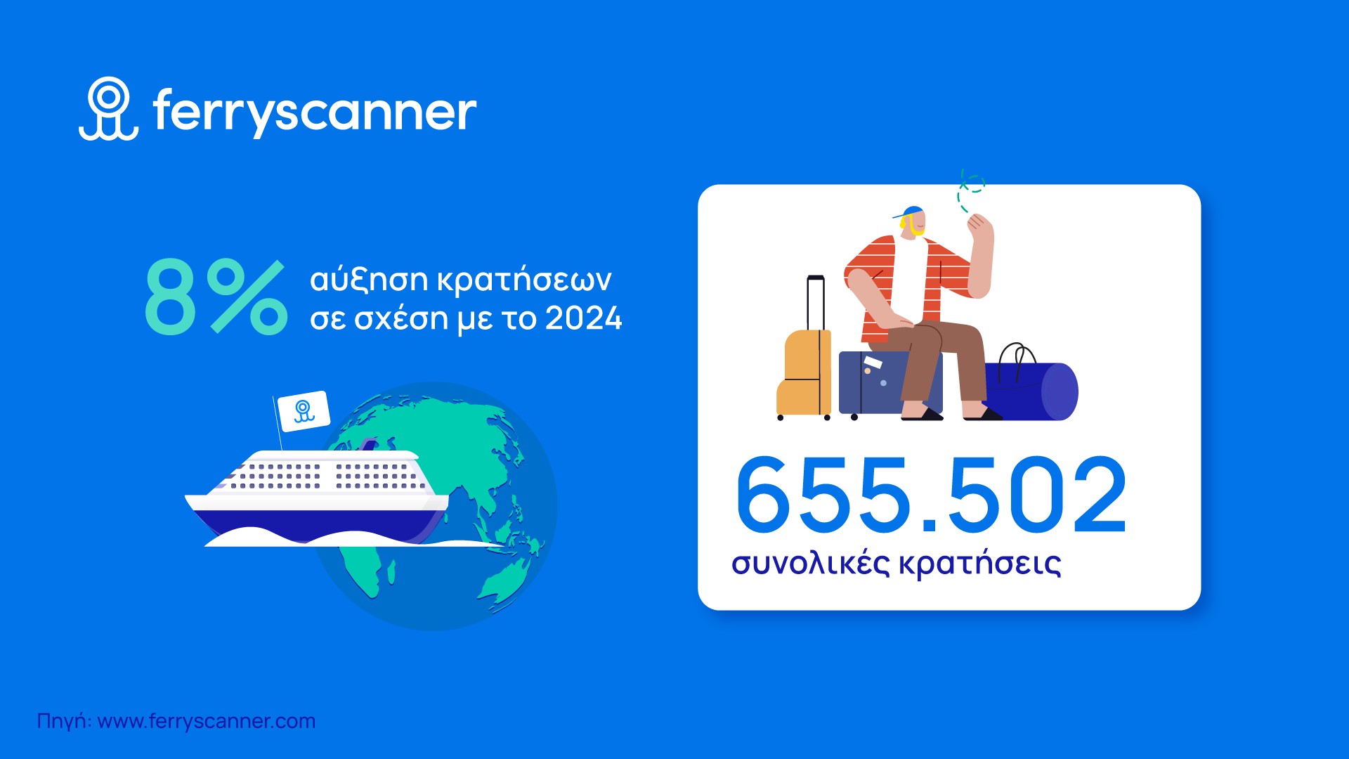 Σύμφωνα με τα ετήσια στοιχεία της Ferryscanner, το 2025 η εταιρεία κατέγραψε πάνω από 655.000 κρατήσεις και 874.000 ταξίδια, σημειώνοντας αύξηση 8% σε σχέση με την προηγούμενη χρονιά. Τα στοιχεία αφορούν το σύνολο των κρατήσεων που πραγματοποιήθηκαν μέσω της ιστοσελίδας και της εφαρμογής της Ferryscanner.