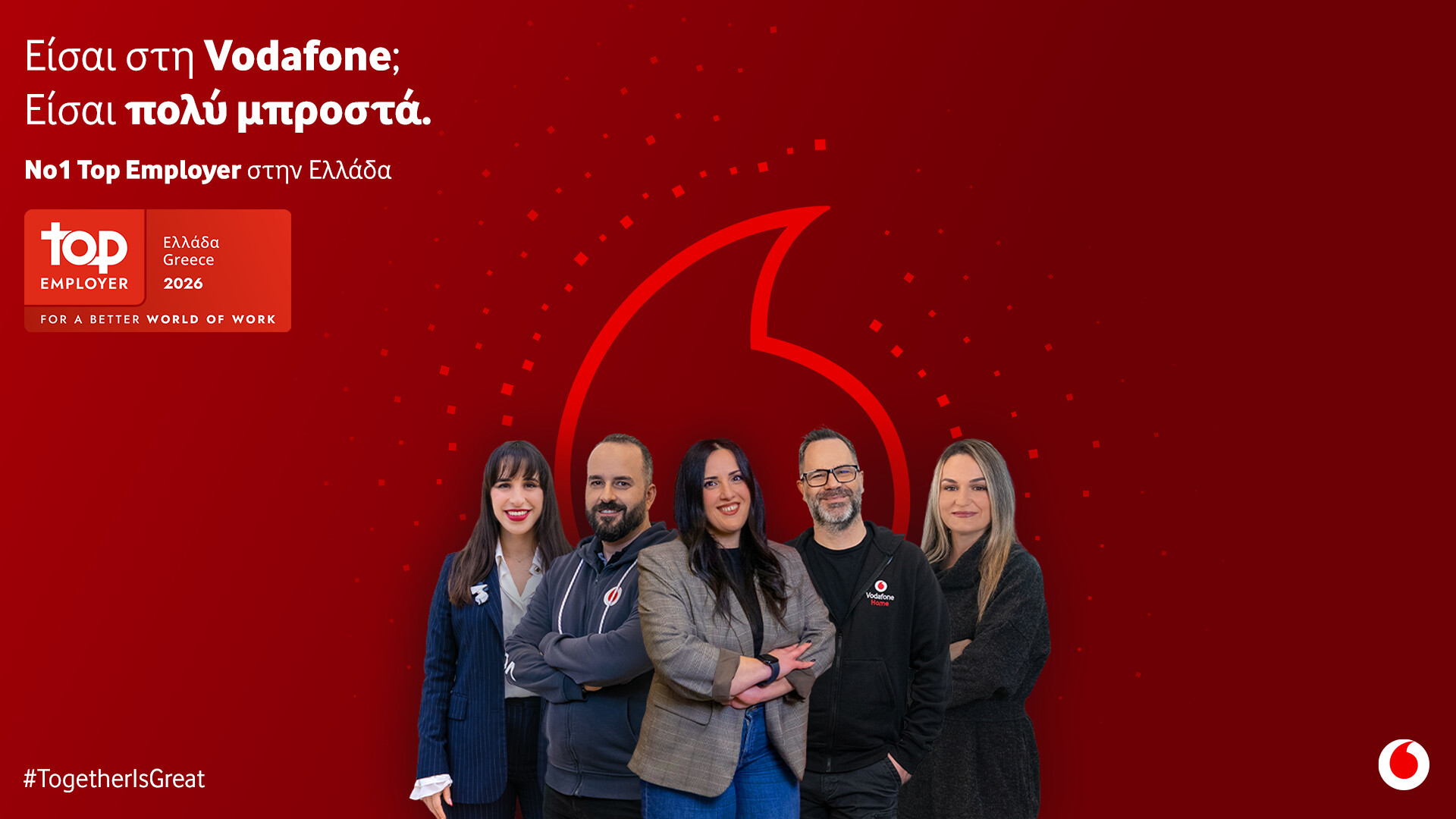 Για τη Vodafone Ελλάδας, το να είσαι Top Employer δεν είναι απλώς ένας τίτλος αλλά καθημερινή πραγματικότητα για τους ανθρώπους της, από την πρώτη μέρα έως κάθε νέα πρόκληση που αναλαμβάνουν. Και τα νούμερα μιλούν από μόνα τους: για τρίτη συνεχόμενη χρονιά η Vodafone κατακτά την 1η θέση καλύτερου εργοδότη στην Ελλάδα, ενώ για 8η χρονιά αναγνωρίζεται ως Top Employer από το διεθνώς αναγνωρισμένο οργανισμό Top Employers Institute.
