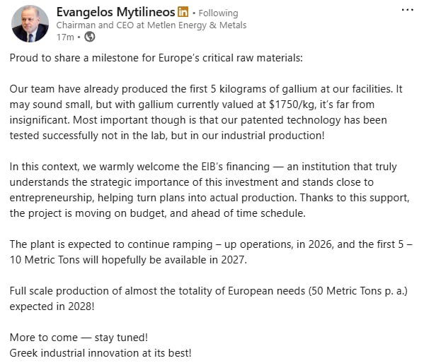«Με υπερηφάνεια μοιραζόμαστε ένα ορόσημο για τις κρίσιμες πρώτες ύλες της Ευρώπης: Η ομάδα μας έχει ήδη παράγει τα πρώτα 5 κιλά γαλλίου στις εγκαταστάσεις μας. Μπορεί να ακούγεται μικρή ποσότητα, όμως, με το γάλλιο να αποτιμάται σήμερα στα 1.750 δολάρια ανά κιλό, μόνο αμελητέα δεν είναι. Το σημαντικότερο, ωστόσο, είναι ότι η πατενταρισμένη τεχνολογία μας δοκιμάστηκε με επιτυχία όχι στο εργαστήριο, αλλά στη βιομηχανική μας παραγωγή!» αναφέρει στην ανάρτησή του.