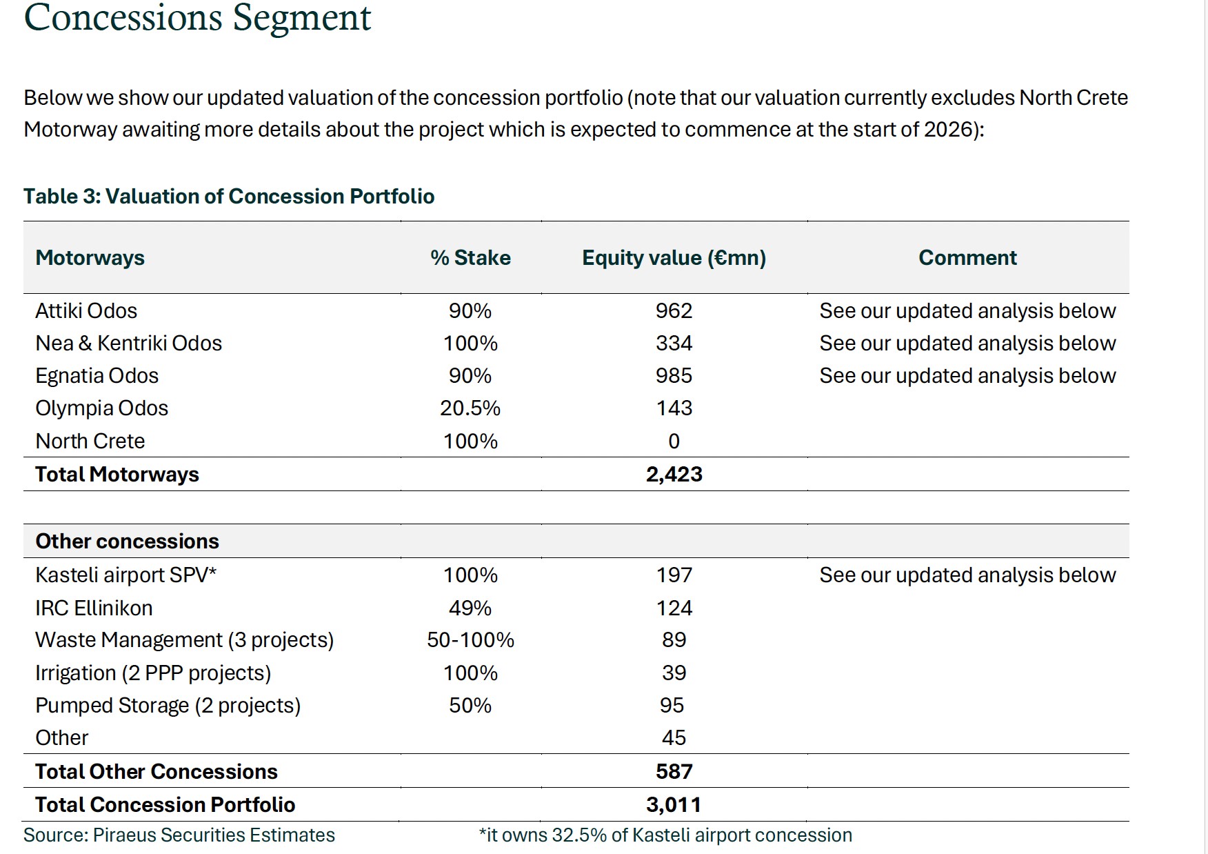 Οι παραχωρήσεις Νέα και Κεντρική Οδός αποτιμώνται συνολικά στα 334 εκατ. ευρώ, με σωρευτικά έσοδα 3,3 δισ. ευρώ την περίοδο 2026-2037 και σωρευτικό EBITDA 2,4 δισ. ευρώ. Οι σωρευτικές διανομές προς τη μητρική εκτιμώνται σε περίπου 400 εκατ. ευρώ. Στο χαρτοφυλάκιο παραχωρήσεων περιλαμβάνονται επίσης το νέο αεροδρόμιο Καστελίου (197 εκατ. ευρώ), η συμμετοχή στο Ελληνικό (IRC Ellinikon – 124 εκατ. ευρώ), έργα διαχείρισης απορριμμάτων (89 εκατ. ευρώ), αρδευτικά ΣΔΙΤ (39 εκατ. ευρώ) και έργα αντλησιοταμίευσης (95 εκατ. ευρώ). Σημειώνεται ότι στο μοντέλο δεν αποδίδεται ακόμη αξία στον Βόρειο Οδικό Άξονα Κρήτης, εν αναμονή περισσότερων στοιχείων, στοιχείο που αφήνει πρόσθετο ανοδικό περιθώριο στην αποτίμηση.