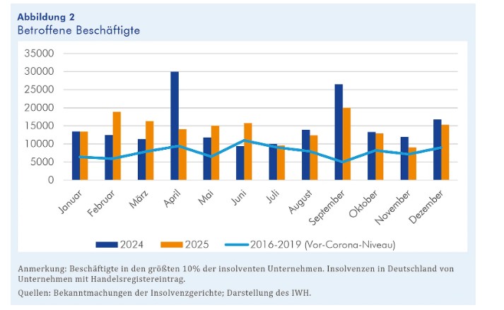 Κατά το σύνολο του έτους 2025, καταγράφηκαν στη Γερμανία 17.604 πτωχεύσεις εταιρειών, αριθμός που αποτελεί το υψηλότερο επίπεδο από το 2005. Χαρακτηριστικό είναι ότι το μέγεθος αυτό υπερβαίνει κατά περίπου 5% ακόμα και τα δεδομένα της μεγάλης χρηματοπιστωτικής κρίσης του 2009.
