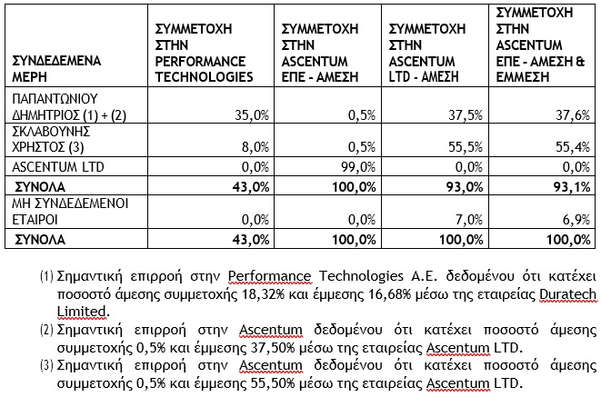 - Η Ascentum αποτελεί συνδεδεμένο μέρος της Εταιρείας, κατά την έννοια του άρθρου 99 του Ν. 4548/2018, καθόσον οι κ.κ. Δημήτριος Παπαντωνίου και Χρήστος Σκλαβούνης, βασικοί μέτοχοι της Εταιρείας συμμετέχουν και στην υπό εξαγορά Ascentum σύμφωνα με τα κάτωθι ποσοστά:
