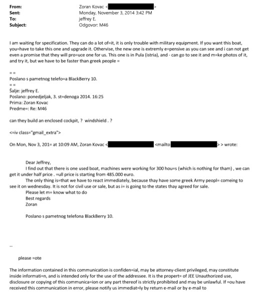 Σε μια πιο προσωπική επικοινωνία το 2014, ο Κροάτης εργολάβος οικοδομών Zoran Kovac ενημερώνει τον Έπσταϊν για ένα μεταχειρισμένο πολεμικό σκάφος (M46) στην Πούλα, τονίζοντας ότι πρέπει να κινηθούν γρήγορα, καθώς «κάποιοι άνθρωποι από τον ελληνικό στρατό» θα πήγαιναν να το δουν. Έπειτα από ανταλλαγή σειράς μηνυμάτων ο Έπσταϊν ξεκαθάρισε πως δεν ενδιαφέρεται τελικά για το σκάφος.