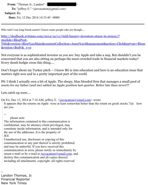 Τα emails αποκαλύπτουν μια έντονη κινητικότητα γύρω από ελληνικά περιουσιακά στοιχεία, με τον Έπσταϊν να δέχεται και να ζητάει συνεχώς ενημερώσεις για επενδυτικές ευκαιρίες. Σε επικοινωνία με τον τότε δημοσιογράφο των New York Times, Landon Thomas Jr., τον Δεκέμβριο του 2014, ο Έπσταϊν σχολίασε ειρωνικά ότι οι αποδόσεις της Apple ήταν καλύτερες από αυτές των ελληνικών μετοχών. Ωστόσο, λίγα χρόνια αργότερα ο Thomas Jr. του έστειλε νέο μήνυμα, για να του υπενθυμίσει πως κακώς δεν επένδυσε αρκετά στα ελληνικά περιουσιακά στοιχεία. Ο Landon Thomas Jr. αποχώρησε από τους New York Times το 2019, όχι με τον καλύτερο δυνατό τρόπο.