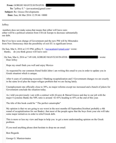 Το ενδιαφέρον του Έπσταϊν δεν ήταν μόνο οικονομικό, αλλά και βαθύτατα πολιτικό. Σε επικοινωνία του με τον Γιώργο Μαντζαβινάτο (τότε ήταν επικεφαλής της Alvarez & Marsal Greece, στη συνέχεια αποχώρησε και πέθανε νέος το 2023) τον Μάρτιο του 2016, ο Έπσταϊν ρωτά ευθέως: «Πιστεύεις ότι η Ελλάδα θα εγκαταλείψει το ευρώ;». Ο αείμνηστος Γ. Μαντζαβινάτος του απαντά αναλύοντας την κατάσταση των συστημικών τραπεζών, όπου τα κόκκινα δάνεια (NPLs) άγγιζαν το 42-45%, και σημειώνει ότι αν ο Κυριάκος Μητσοτάκης γίνει πρωθυπουργός, η πιθανότητα Grexit θα μειωθεί σημαντικά.