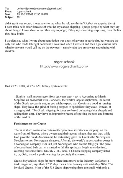 Τα νέα στοιχεία που δημοσιοποίησαν οι αμερικανικές αρχές για την αλληλογραφία του Τζέφρι Έπσταϊν, του ανθρώπου που φαίνεται πως συντηρούσε ένα διεθνές δίκτυο πορνείας για την παγκόσμια ελίτ και πέθανε στη φυλακή τον Αύγουστο του 2019, δείχνουν πως ο επιχειρηματίας/επενδυτικός σύμβουλος είχε αναπτύξει στενό ενδιαφέρον για την Ελλάδα κατά την περίοδο της οικονομικής κρίσης. Το powergame.gr συγκέντρωσε κάποια από αυτά τα emails και τα δημοσιεύει, με τη σημαντική διευκρίνιση πως η ανταλλαγή μηνυμάτων ή οι αναφορές σε συγκεκριμένα πρόσωπα στα emails δεν μεταφράζονται σε εμπλοκή των προσώπων αυτών στην εγκληματική δραστηριότητα του Έπσταϊν.