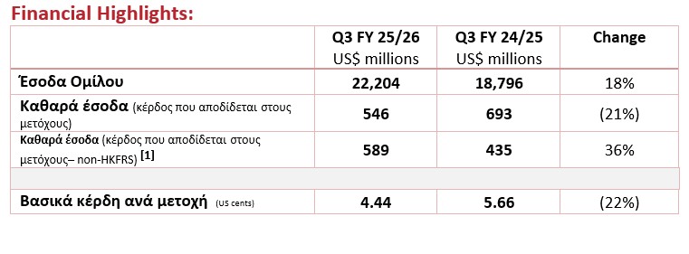 Κατά τη διάρκεια του τριμήνου, τα συνολικά έσοδα του Ομίλου ανήλθαν σε ιστορικό υψηλό για οικονομικό τρίμηνο, φτάνοντας τα 22,2 δισ. δολάρια ΗΠΑ, αυξημένα κατά 18% σε ετήσια βάση, με όλες τις επιχειρηματικές μονάδες του Ομίλου να καταγράφουν διψήφια ετήσια ανάπτυξη. Εξαιρουμένων μη λειτουργικών, μη ταμειακών στοιχείων και εφάπαξ κερδών και επιβαρύνσεων στα Γ’ τρίμηνα των οικονομικών ετών 2024/25 και 2025/26, το προσαρμοσμένο καθαρό εισόδημα (κέρδη που αναλογούν στους μετόχους – μη HKFRS)[1] αυξήθηκε κατά 36% σε ετήσια βάση, φτάνοντας τα 589 εκατ. δολάρια ΗΠΑ, με το περιθώριο προσαρμοσμένου καθαρού εισοδήματος[1] να διευρύνεται στο 2,7%.