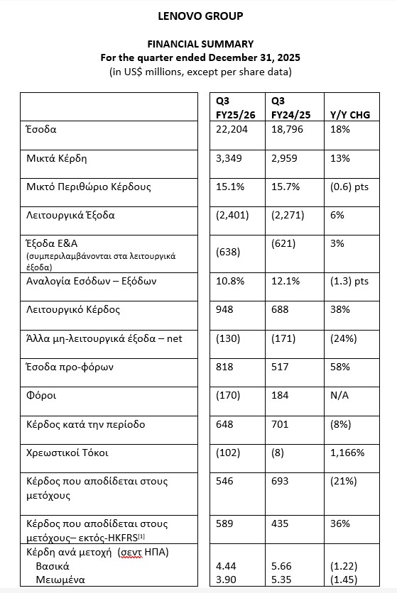 Η Lenovo Group Limited (HKSE: 992) (ADR: LNVGY), μαζί με τις θυγατρικές της («ο Όμιλος»), ανακοίνωσε σήμερα τα αποτελέσματα για το τρίτο τρίμηνο του οικονομικού έτους 2025/26, ένα τρίμηνο που χαρακτηρίστηκε από έσοδα-ρεκόρ, επιταχυνόμενη κερδοφορία και συνεχιζόμενη επέκταση των εσόδων από Τεχνητή Νοημοσύνη (AI).