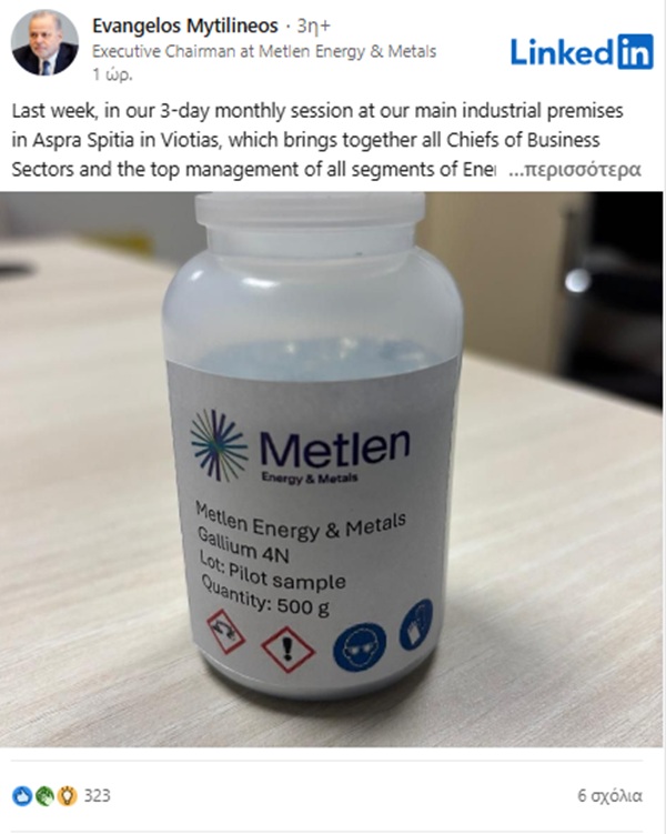 Το πρώτο τυποποιημένο πακέτο 500 γραμμαρίων με Γάλλιο παρουσίασε ο Ευάγγελος Μυτιληναίος. Ο εκτελεστικός πρόεδρος της Metlen, με ανάρτησή του στο Linkedin, έδωσε στη δημοσιότητα και τη σχετική φωτογραφία. Αναλυτικά η ανάρτηση: