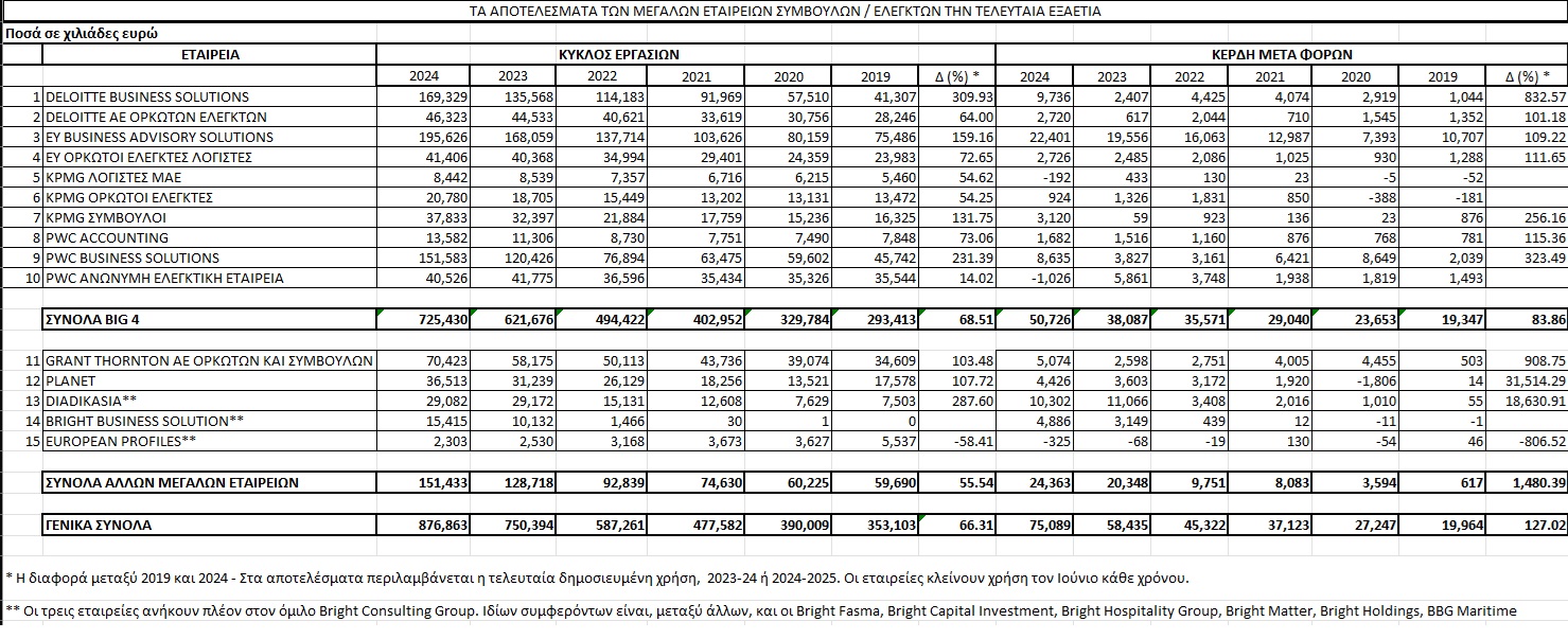 Συνολικό κύκλο εργασιών που προσεγγίζει τα 3,5 δισεκατομμύρια ευρώ είχαν οι 15 από τις μεγαλύτερες εταιρείες συμβούλων/ελεγκτών της Ελλάδας την περίοδο 2019-2024 και συγκεκριμένα μέχρι τον Ιούνιο του 2025, με βάση τις δημοσιευμένες λογιστικές καταστάσεις. Τα τελευταία χρόνια οι μεγάλες εταιρείες συμβούλων, οι γνωστές Big 4 (E&Y, PwC, Deloitte και KPMG), σημείωναν απανωτά ρεκόρ εσόδων, όπως και οι εγχώριες εταιρείες (Planet, Diadikasia), αλλά και κάποιοι νεοεισερχόμενοι, όπως η Bright Consulting Group, η οποία από μηδενικά έσοδα το 2019 παρουσίασε το 2024 συνολικό κύκλο εργασιών κοντά στα 45 εκατ. ευρώ, χωρίς να περιλαμβάνονται τα έσοδα σειράς άλλων θυγατρικών που διαθέτει πλέον.