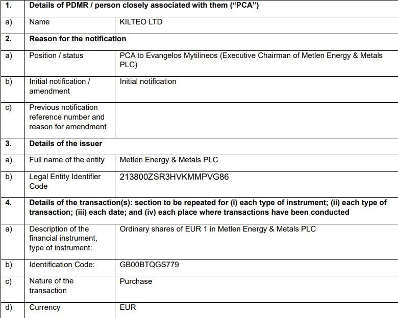 O Εκτελεστικός Πρόεδρος της Metlen, Eυάγγελος Μυτιληναίος αγόρασε 50.000 μετοχές της εταιρίας, στην τιμή των 32,5918 ευρώ ανά μετοχή, μέσω της Kilteo, σύμφωνα με ανακοίνωση στο Χρηματιστήριο.