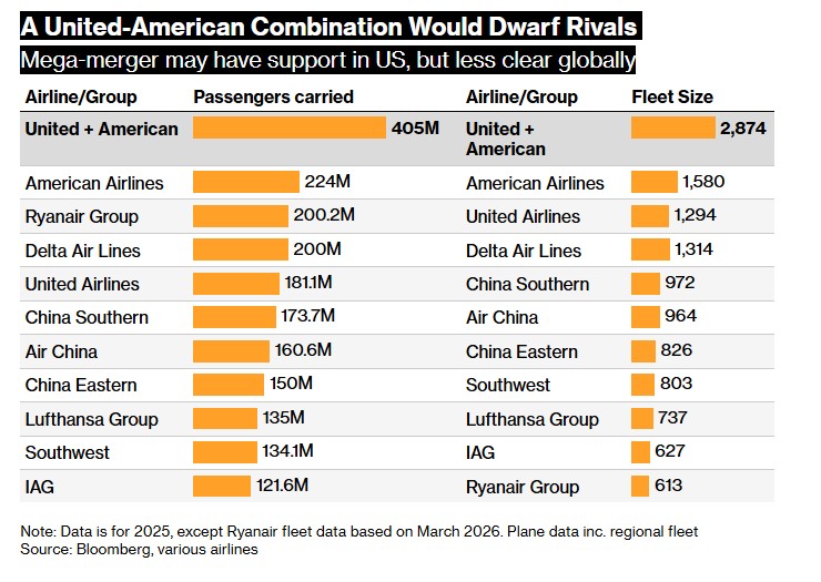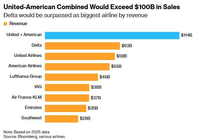 Η United και η American συγκαταλέγονται ήδη στις τέσσερις κορυφαίες αεροπορικές εταιρείες των Ηνωμένων Πολιτειών, ελέγχοντας από κοινού πάνω από το ένα τρίτο της εγχώριας αγοράς. Μια πιθανή συνένωση των δύο θα οδηγούσε στη δημιουργία ενός «γιγαντιαίου» αερομεταφορέα με έσοδα που θα ξεπερνούσαν τα 100 δισ. δολάρια και στόλο άνω των 2.800 αεροσκαφών, ξεπερνώντας ακόμη και την Delta Air Lines, που σήμερα κατέχει τον τίτλο της μεγαλύτερης αεροπορικής εταιρείας παγκοσμίως βάσει εσόδων.