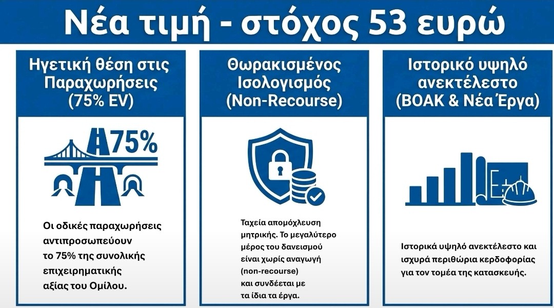 Παρά τη σημαντική άνοδο της μετοχής από τις αρχές του έτους, η Santander εκτιμά ότι η αγορά εξακολουθεί να αποτιμά συγκρατημένα τον όμιλο. Το χαρτοφυλάκιο αυτοκινητοδρόμων αποτιμάται περίπου στα 1,2 δισ. ευρώ για το 2027, επίπεδο χαμηλότερο τόσο από το επενδεδυμένο κεφάλαιο (περίπου 1,4 δισ. ευρώ έως το 2026), όσο και από την εκτιμώμενη εύλογη αξία .
