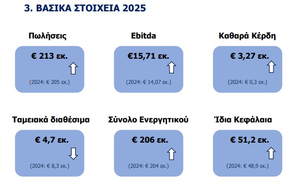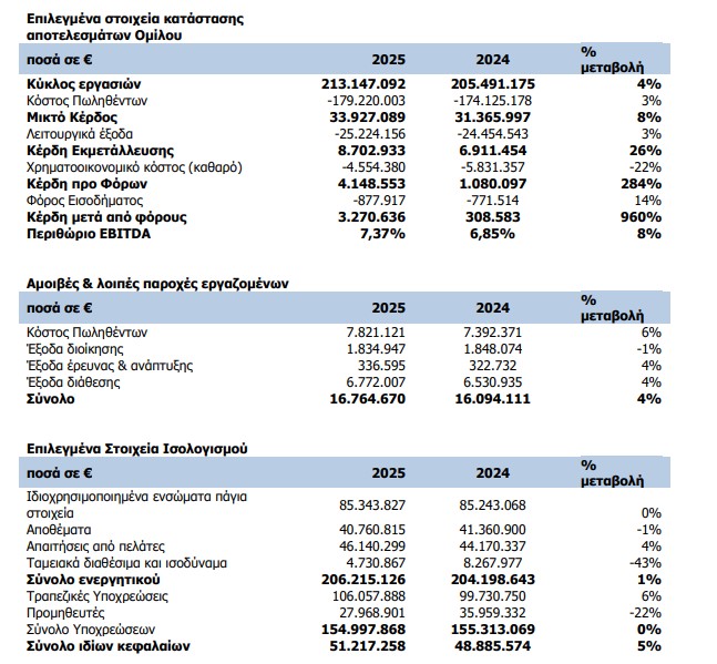 Πιο συγκεκριμένα ο κύκλος εργασιών το 2025 σε ενοποιημένο επίπεδο ανήλθε στα 213,15 εκατ. ευρώ., σημειώνοντας αύξηση 3,73% σε σχέση με το 2024 και τα ενοποιημένα κέρδη προ τόκων, φόρων και αποσβέσεων (EBITDA) διαμορφώθηκαν στα 15,71 εκατ. ευρώ σημειώνοντας αύξηση 11,63%, σε σχέση με το 2024.