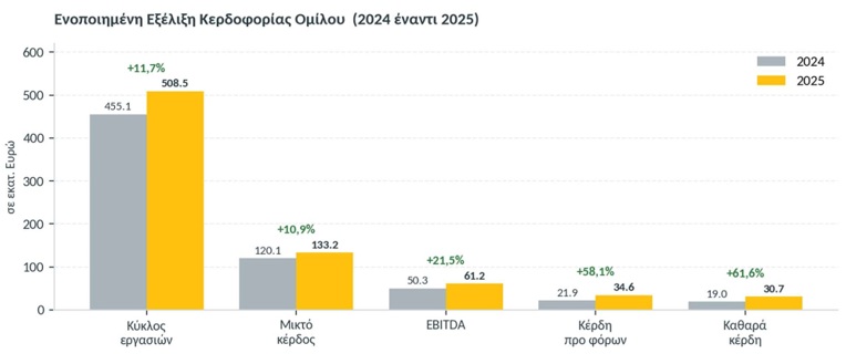 Άνοδο 21,5% στα EBITDA εμφάνισε η Alumil το 2025, στα 61,2 εκατ. ευρώ. Τα καθαρά κέρδη της εταιρείας για τη χρήση διαμορφώθηκαν σε 30,7 εκατ. ευρώ, καταγράφοντας άλμα 61,6%. Στα 508,5 εκατ. ευρώ ήταν ο κύκλος εργασιών, στο +11,7%.