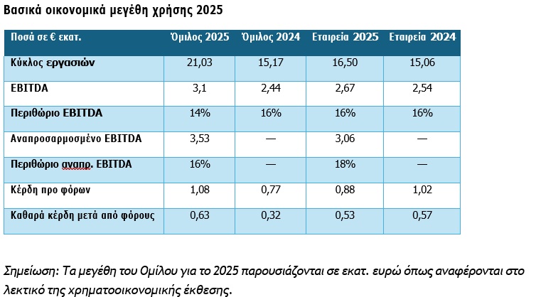 Σε επίπεδο μητρικής εταιρείας, ο κύκλος εργασιών ανήλθε σε €16,5 εκατ., έναντι €15,06 εκατ. κατά τη χρήση 2024 μία αύξηση κατά 9%, ενώ το EBITDA διαμορφώθηκε σε €2,67 εκατ., έναντι €2,54 εκατ. την προηγούμενη χρήση. Το περιθώριο EBITDA της μητρικής ανήλθε σε 16%, ενώ το αναπροσαρμοσμένο EBITDA διαμορφώθηκε σε 18% επί του κύκλου εργασιών, επιβεβαιώνοντας τη λειτουργική ανθεκτικότητα και την κερδοφορία του βασικού πυρήνα δραστηριοτήτων της Εταιρείας.